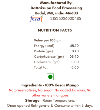 The pulp is made from Kesar mango, without adding any Sugar, Preservatives, Water or any other ingredients.