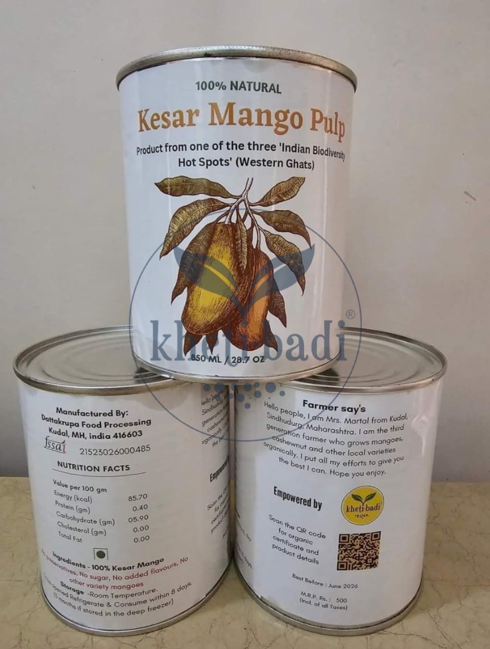 1 can contains 850g pulp (juice) from 100% Kesar Mango.